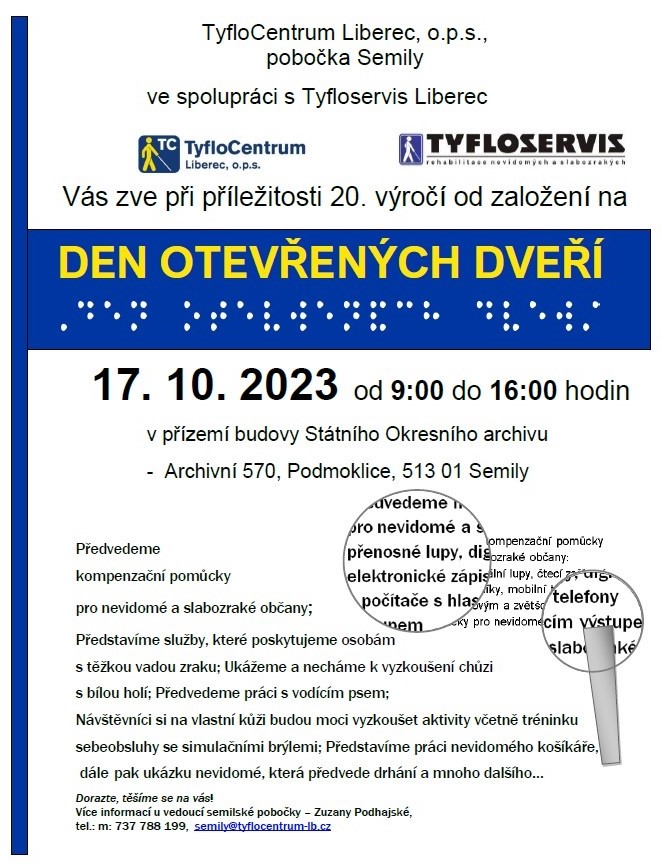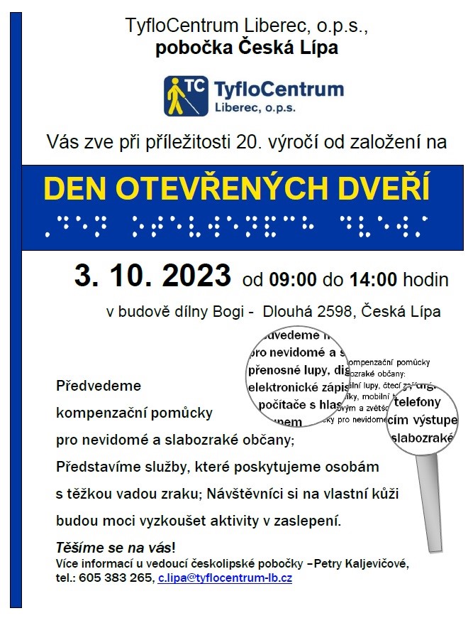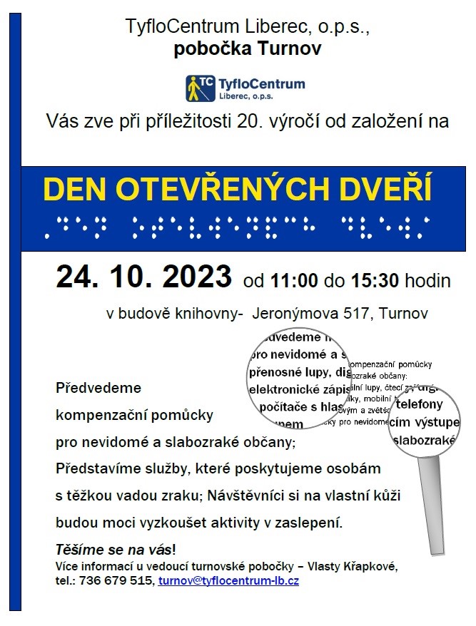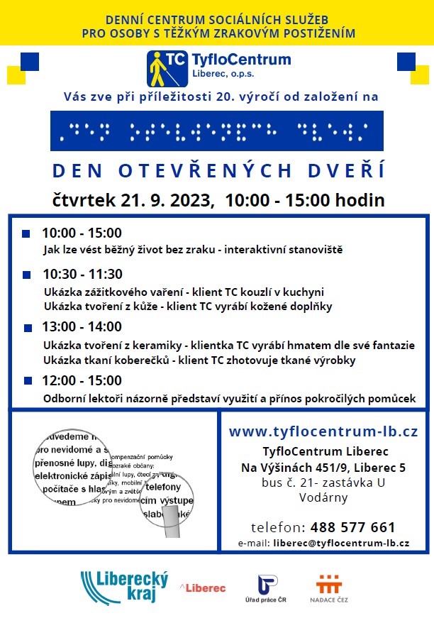 Srdečně Vás zveme na Dny ozevřených dveří poboček TyfloCentra Liberec v následujích dnech: